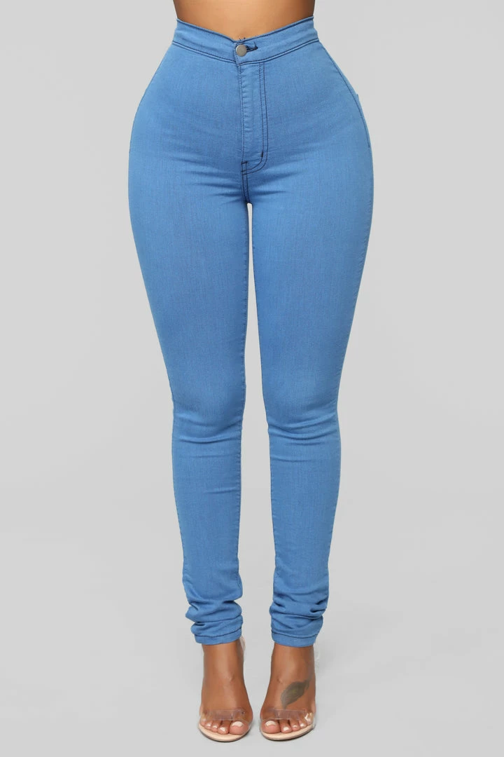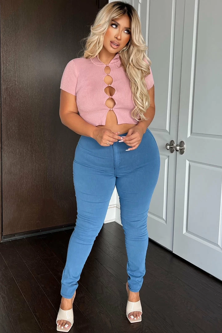 Consider your waist instantly snatched. Our Super High Waist Denim Skinnies will hug your curves tight while still allowing you to move freely. Featuring 2 round back pockets and a cotton-poly-spandex blend, you’ll want these jeans in every color.