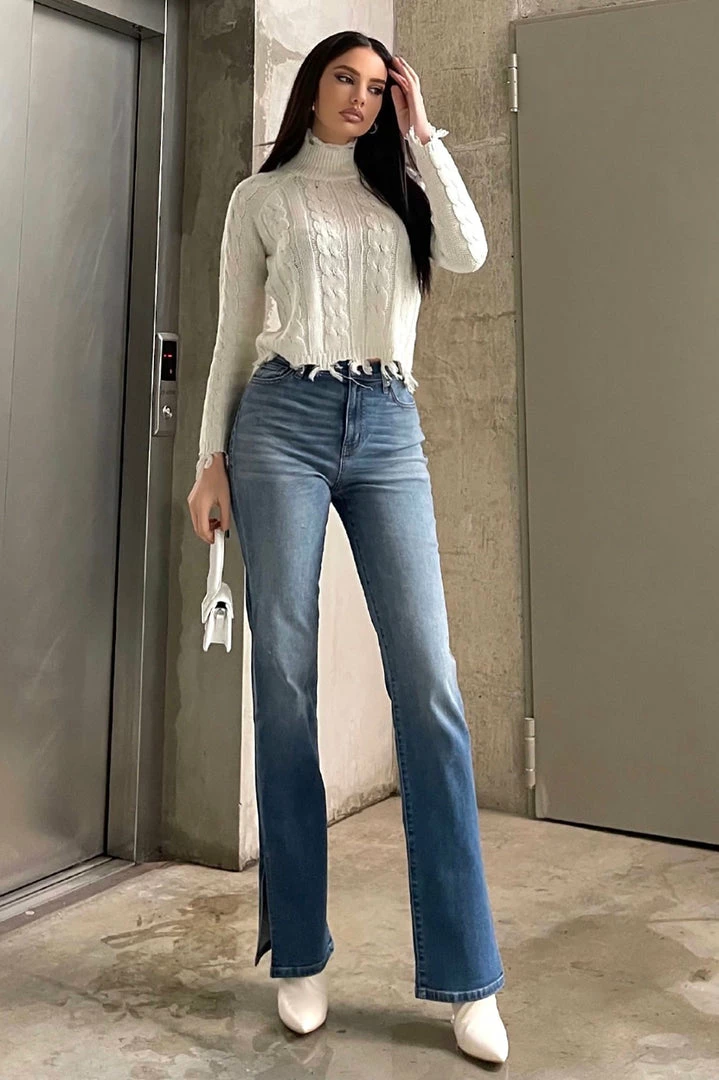 Outlet 🌟 Fashion Nova Straight Leg 👖 Jeans Killing ‘Em Softly Side Split Jean – Medium Blue Wash 🌟
